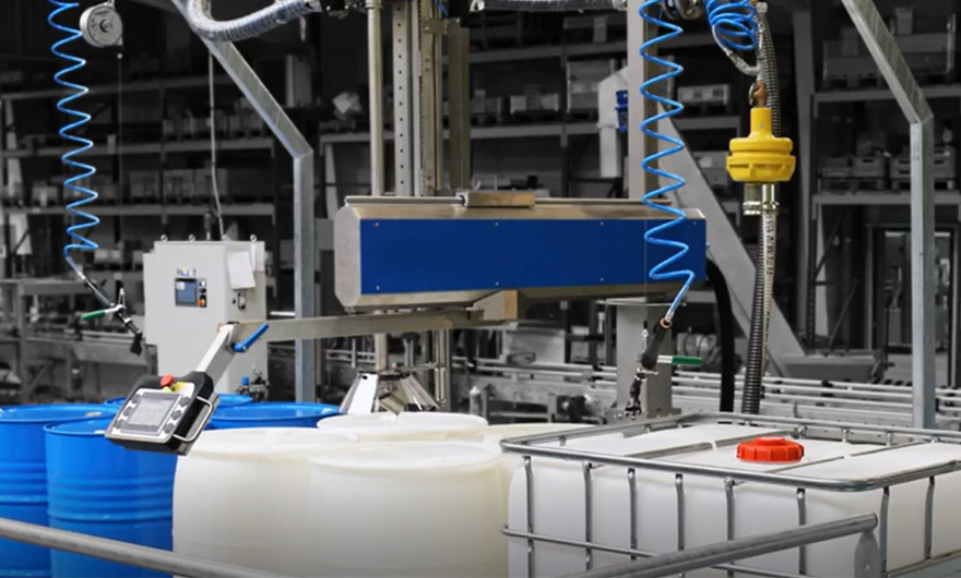 從包裝桶底部采液下式傘狀灌裝,可以抑制泡沫產(chǎn)生,防止物料飛濺;也可抑制灌裝過(guò)程中產(chǎn)生靜電,搭配充氣裝置,可極大的消除易爆液體灌裝時(shí)所產(chǎn)生之危害。